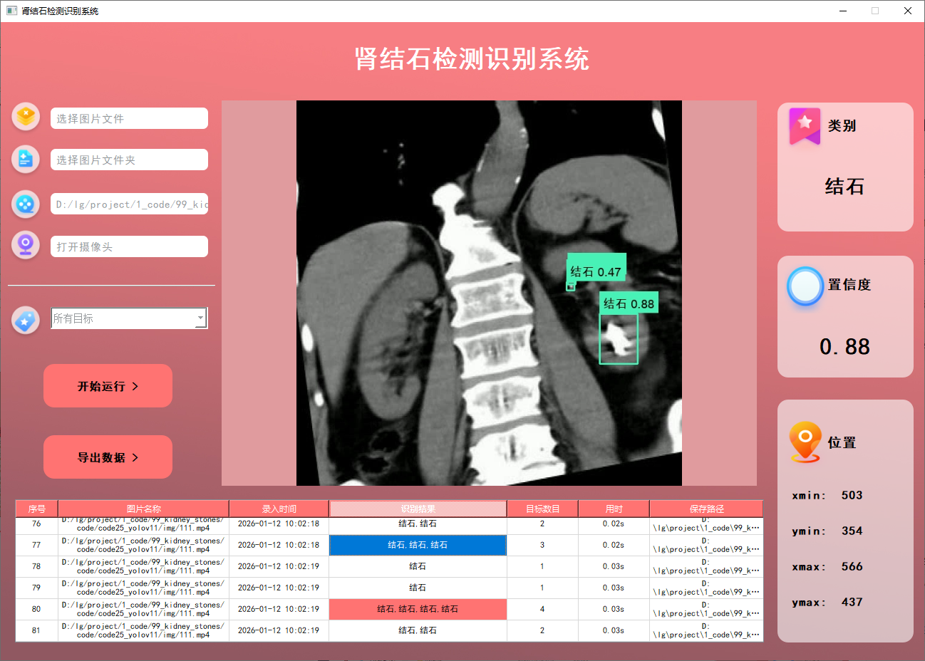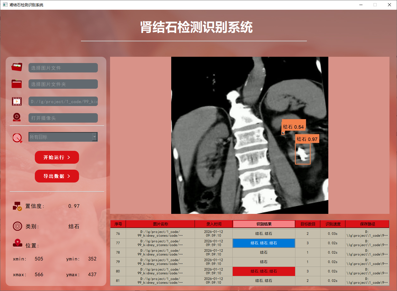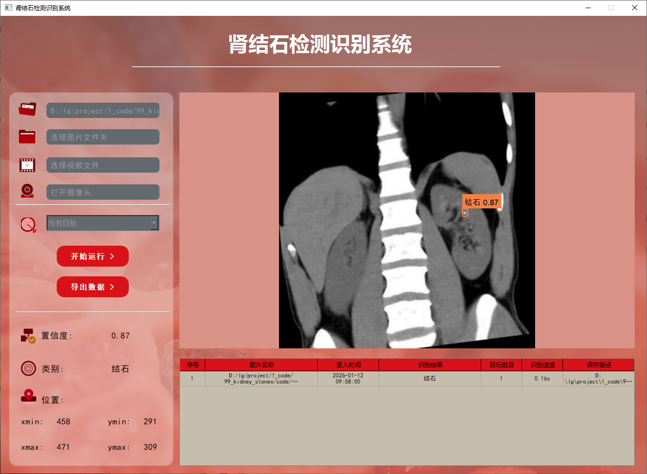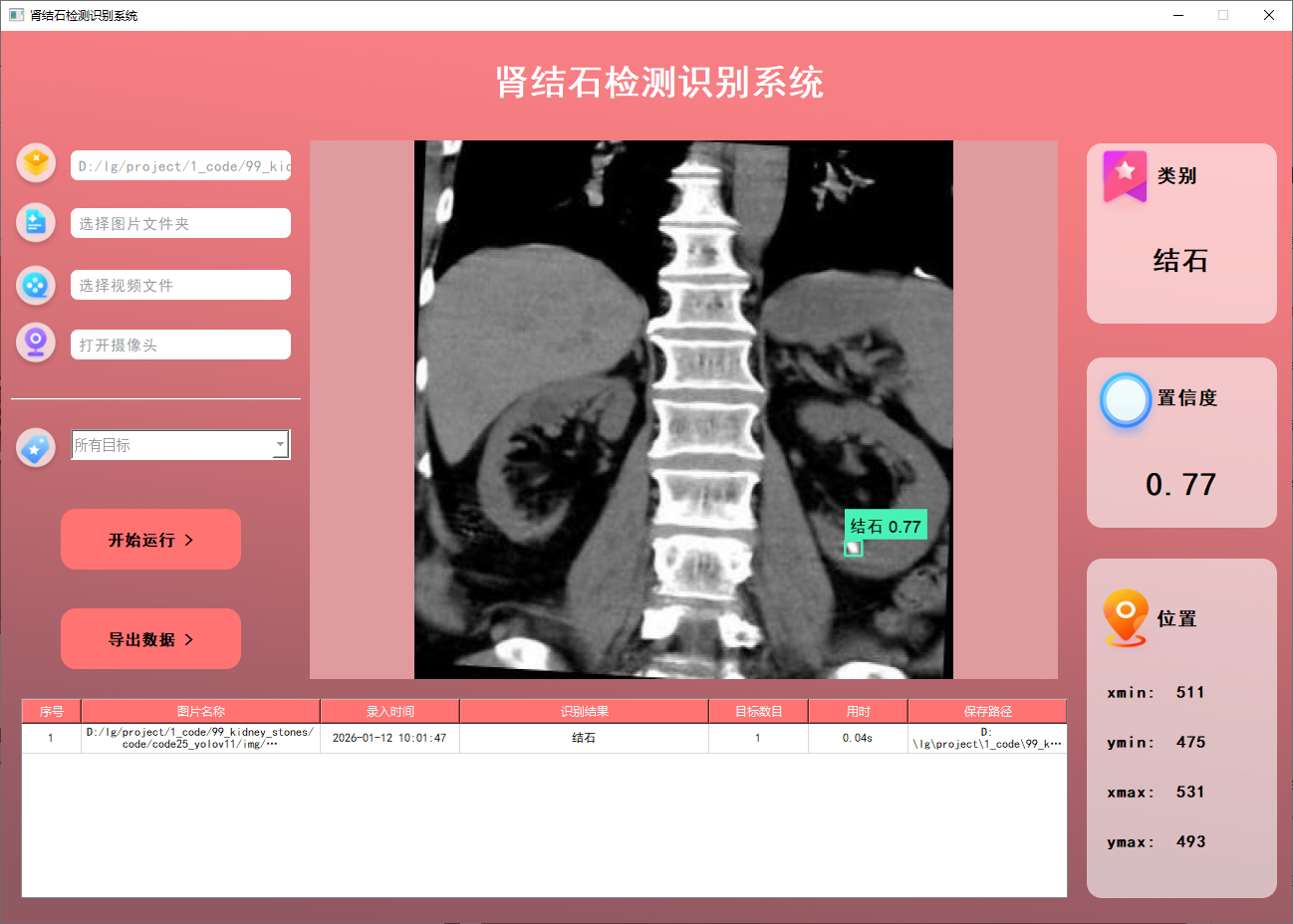 此外,我们开发了一款带有UI界面的肾结石检测识别系统,支持实时检测肾结石,并能够直观地展示检测结果。系统采用Python与PyQt5开发,可以对图片、视频及摄像头输入进行目标检测,同时支持检测结果的保存。本文还提供了完整的Python代码和详细的使用指南,供有兴趣的读者学习参考。获取完整代码资源,请参见文章末尾。