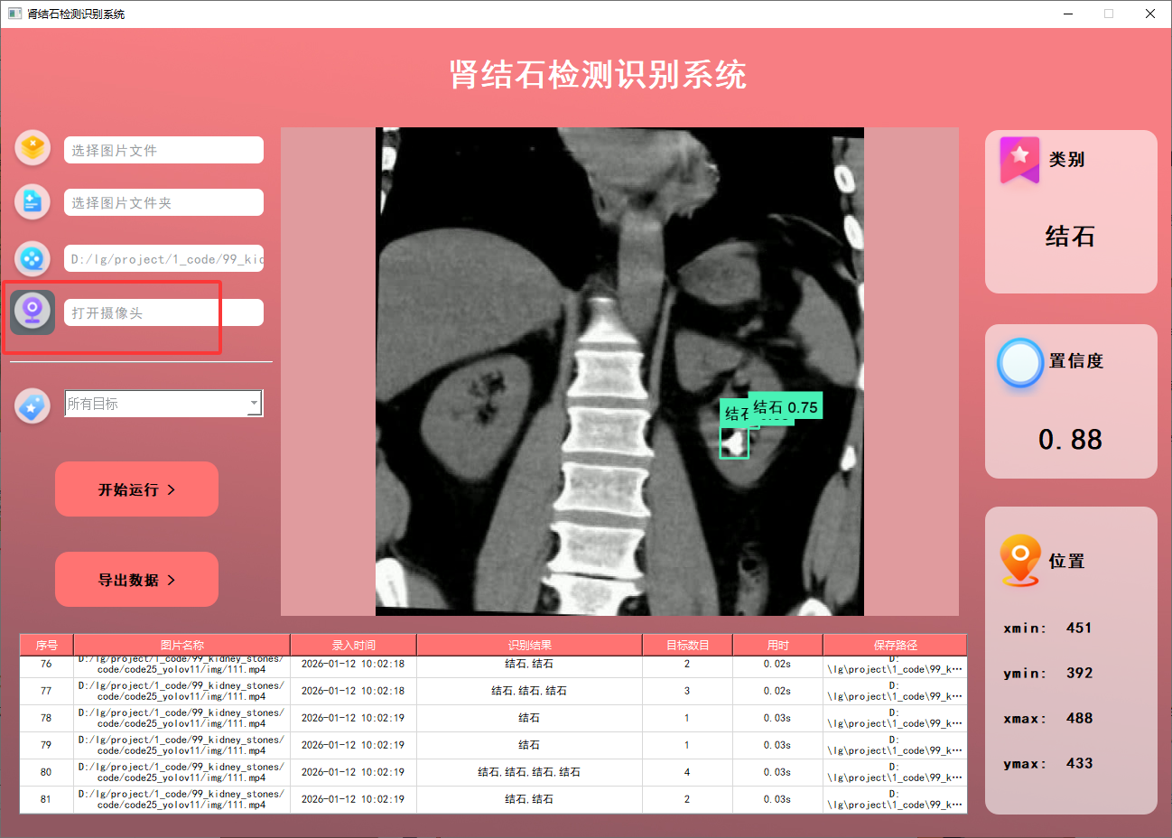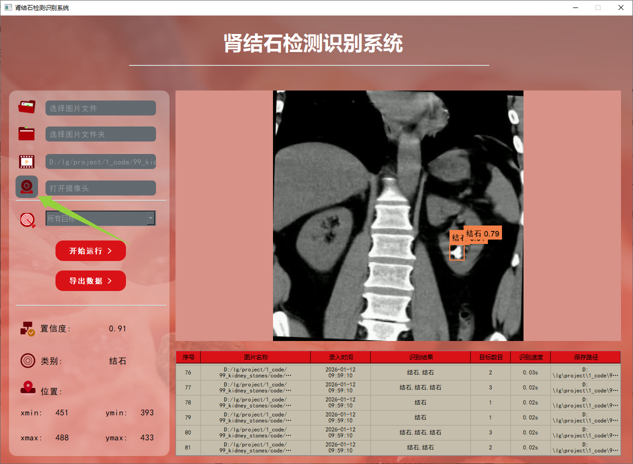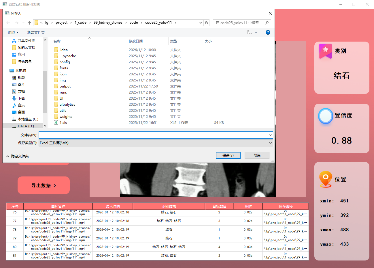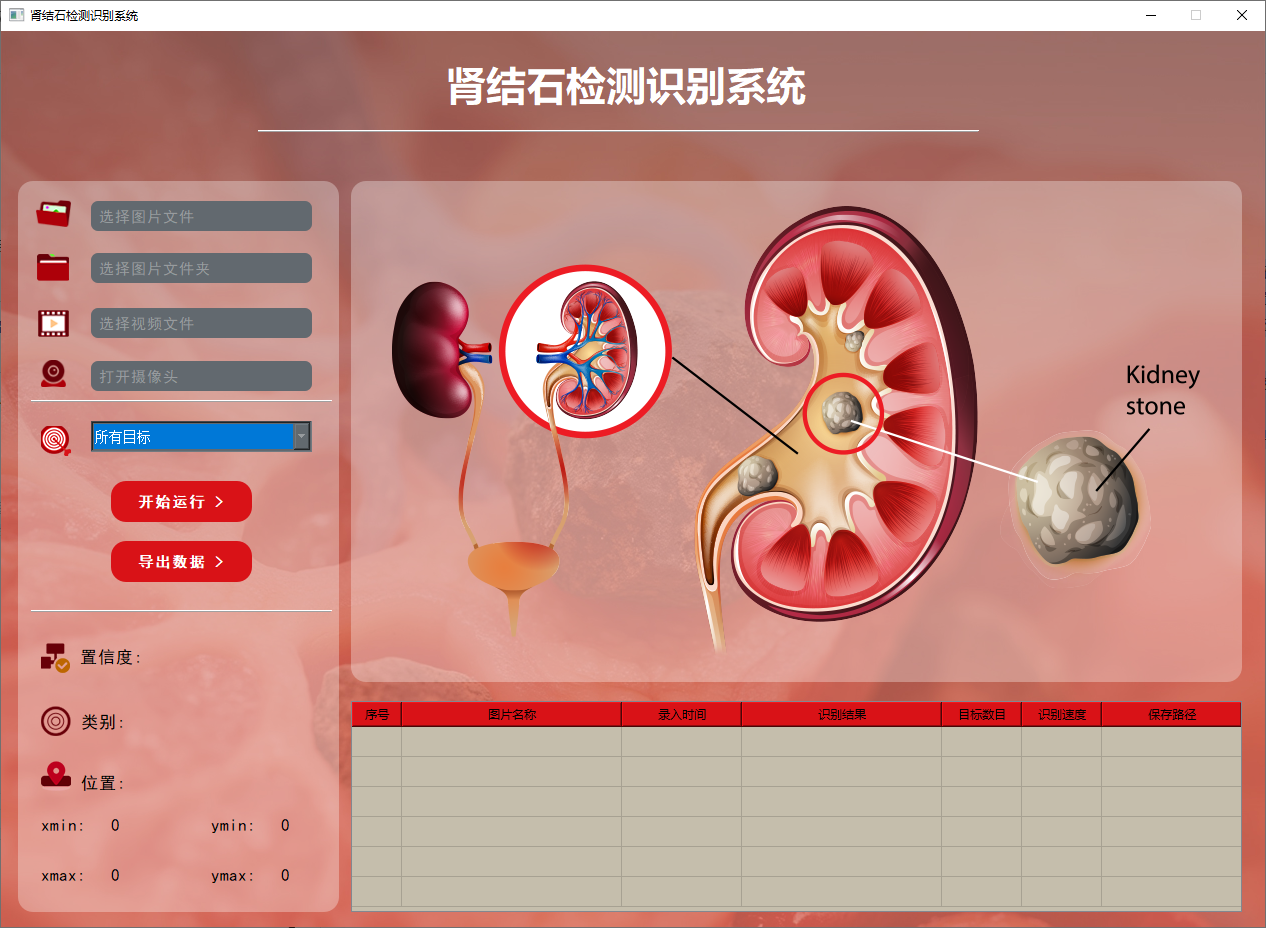 此外,我们开发了一款带有UI界面的肾结石检测识别系统,支持实时检测肾结石,并能够直观地展示检测结果。系统采用Python与PyQt5开发,可以对图片、视频及摄像头输入进行目标检测,同时支持检测结果的保存。本文还提供了完整的Python代码和详细的使用指南,供有兴趣的读者学习参考。获取完整代码资源,请参见文章末尾。
