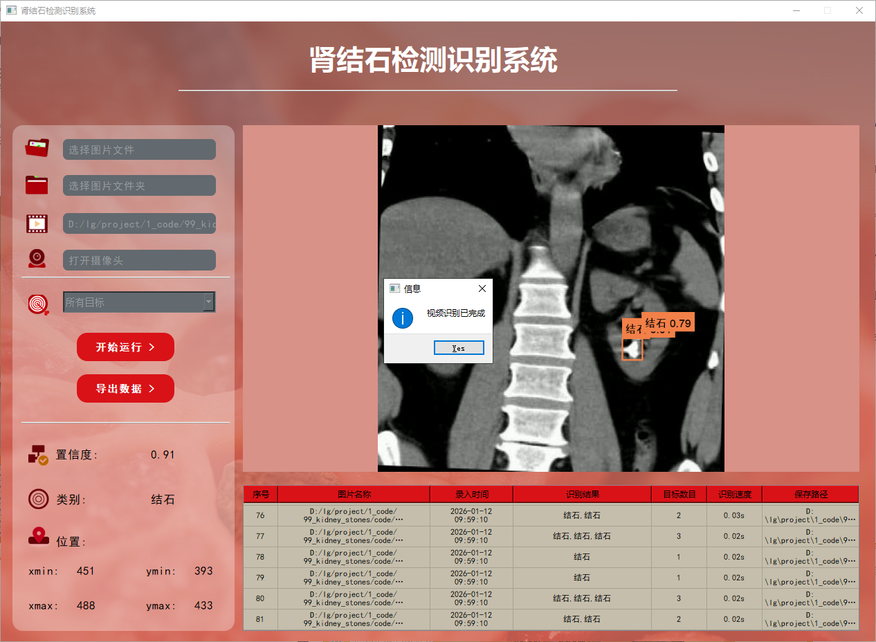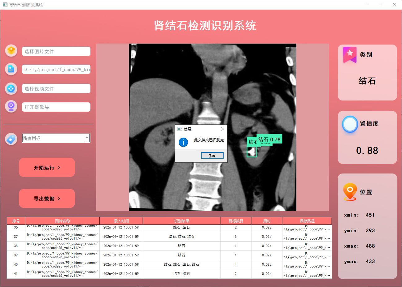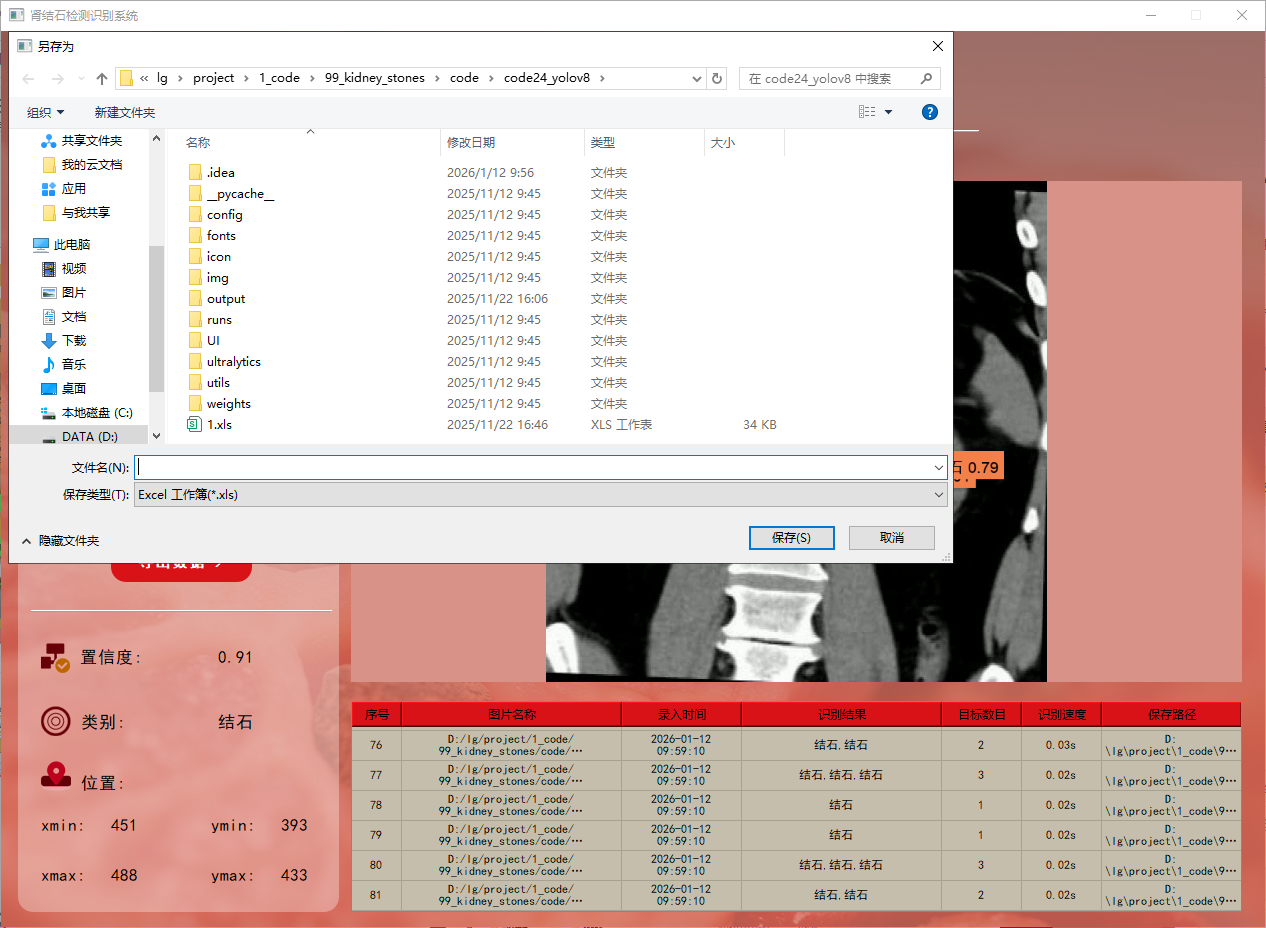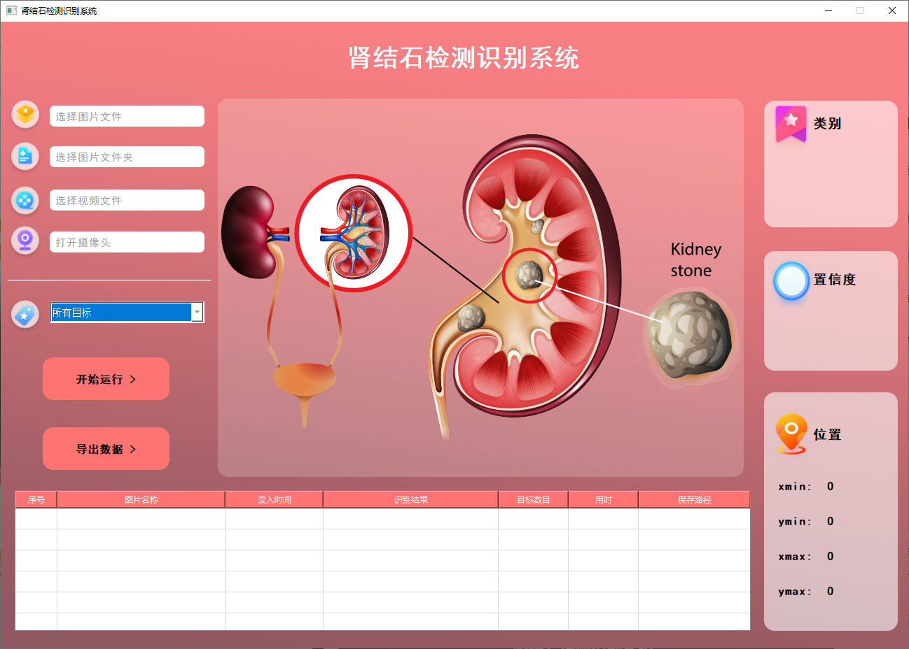 此外,我们开发了一款带有UI界面的肾结石检测识别系统,支持实时检测肾结石,并能够直观地展示检测结果。系统采用Python与PyQt5开发,可以对图片、视频及摄像头输入进行目标检测,同时支持检测结果的保存。本文还提供了完整的Python代码和详细的使用指南,供有兴趣的读者学习参考。获取完整代码资源,请参见文章末尾。