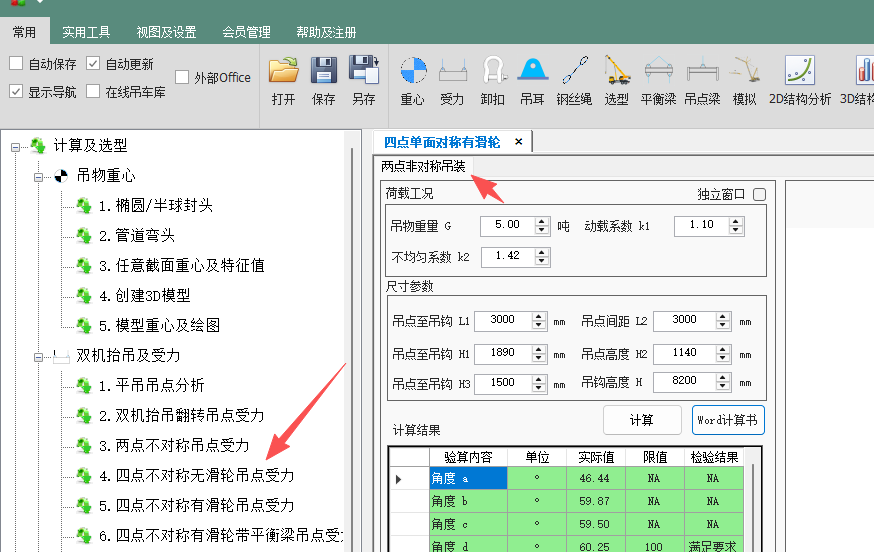 - 在软件左侧导航栏,依次展开 "计算及选型" -> "抬吊及受力分配",点击 "5. 四点不对称有滑轮吊点受力" 进入模块。