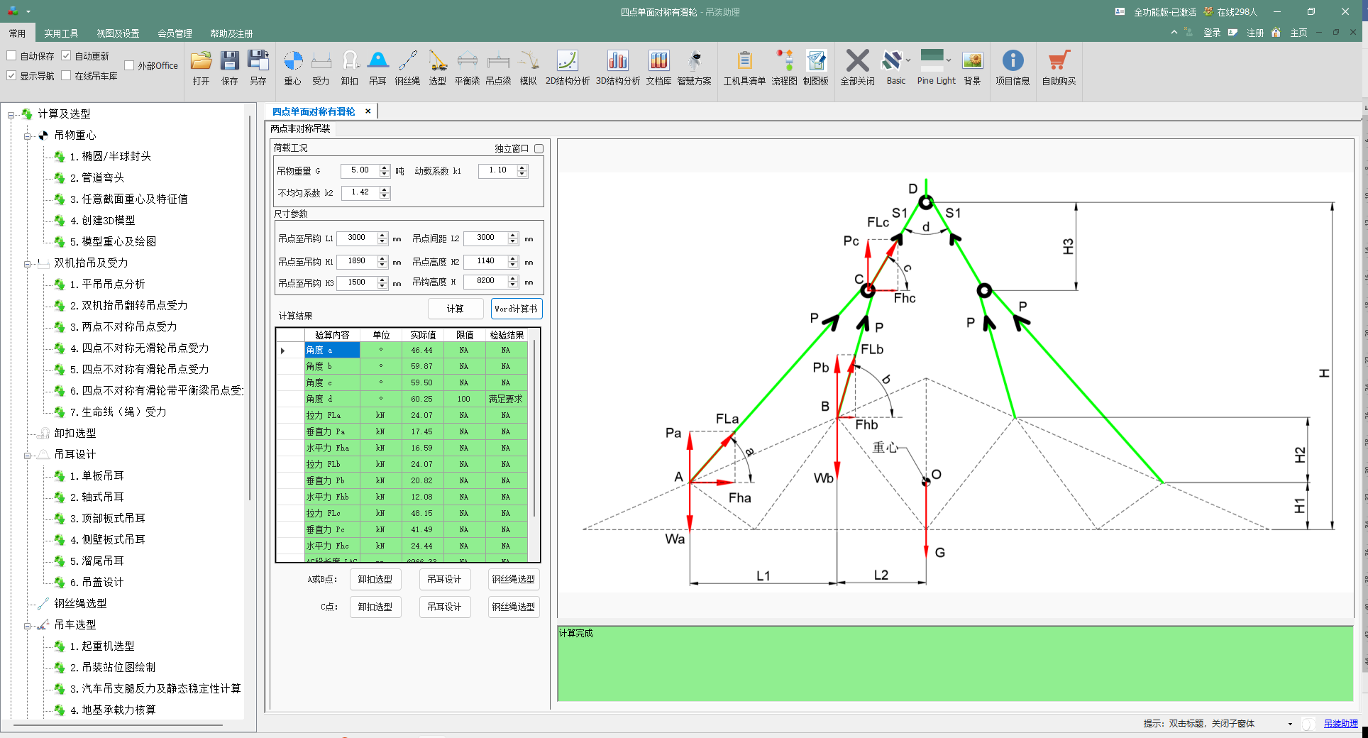 | 两侧拉力不等 (FLa ≠ FLc) | 由于H2的存在以及L1可能不同,导致两侧滑轮组承担的载荷不同。软件算法精确求解此分配关系,找出FLmax。 |