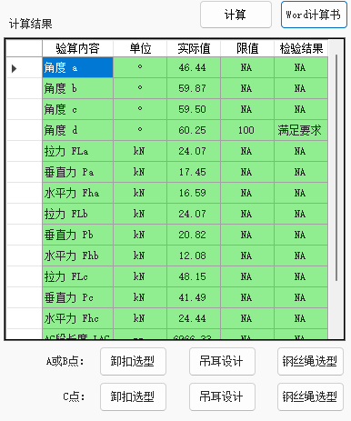 4.1 结果传递:利用界面下方的按钮,将计算出的 FLmax(最大钢丝绳拉力)传递至"钢丝绳选型",将对应的 吊点力(Pa等)传递至"吊耳设计"和"卸扣选型"。
