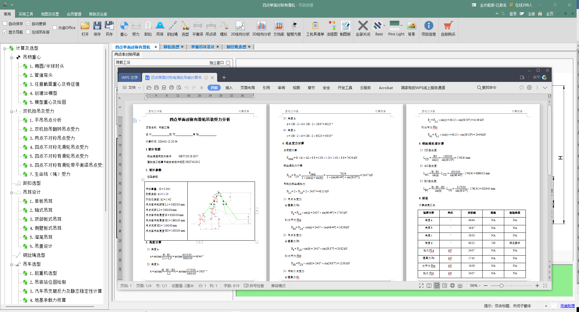 - 被动均载与超静定求解:独创算法精确求解"四点单面对称有滑轮"这一超静定体系的受力。同侧(A与B,C与D)的钢丝绳拉力因滑轮作用而自动相等(FLa = FLb),软件自动分配两侧滑轮组的受力,实现精确计算。