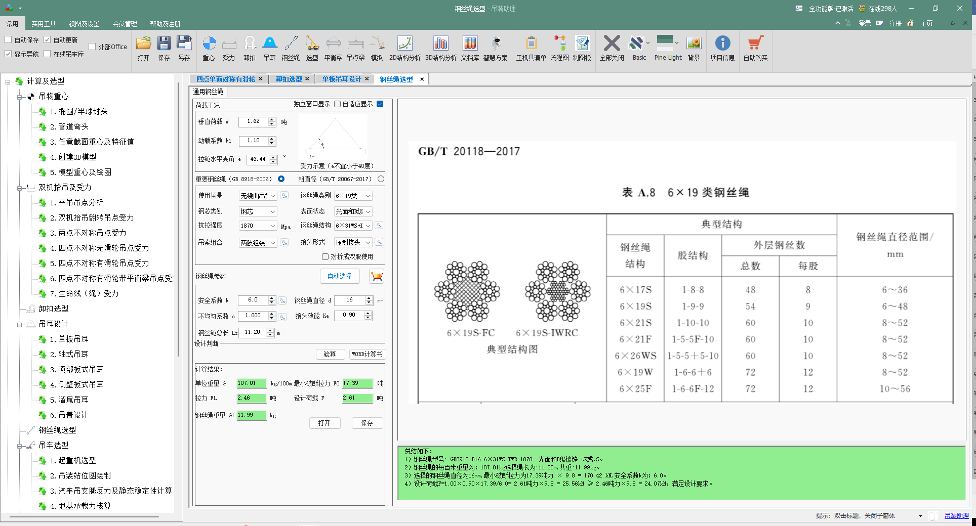 - 看极值:查看"极值计算"输出的 FLmax(最大钢丝绳拉力),判断选用的钢丝绳破断拉力是否足够(安全系数通常≥6)。