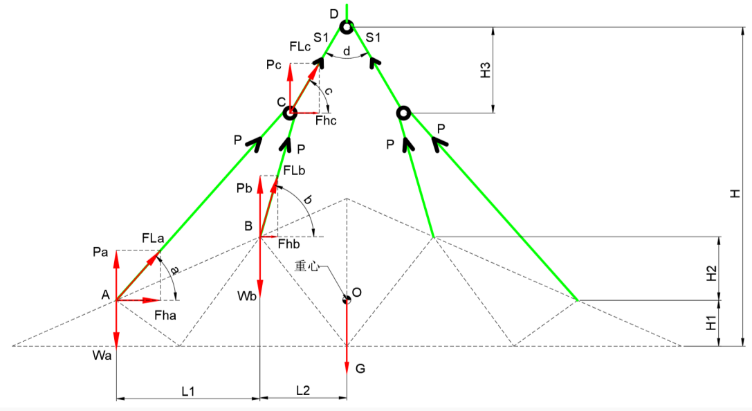 | H1 | H₁ | 外侧吊点群的高度基准。决定了该侧钢丝绳夹角a的大小。H1越大,夹角a通常越大,该侧钢丝绳拉力相对越大。 |