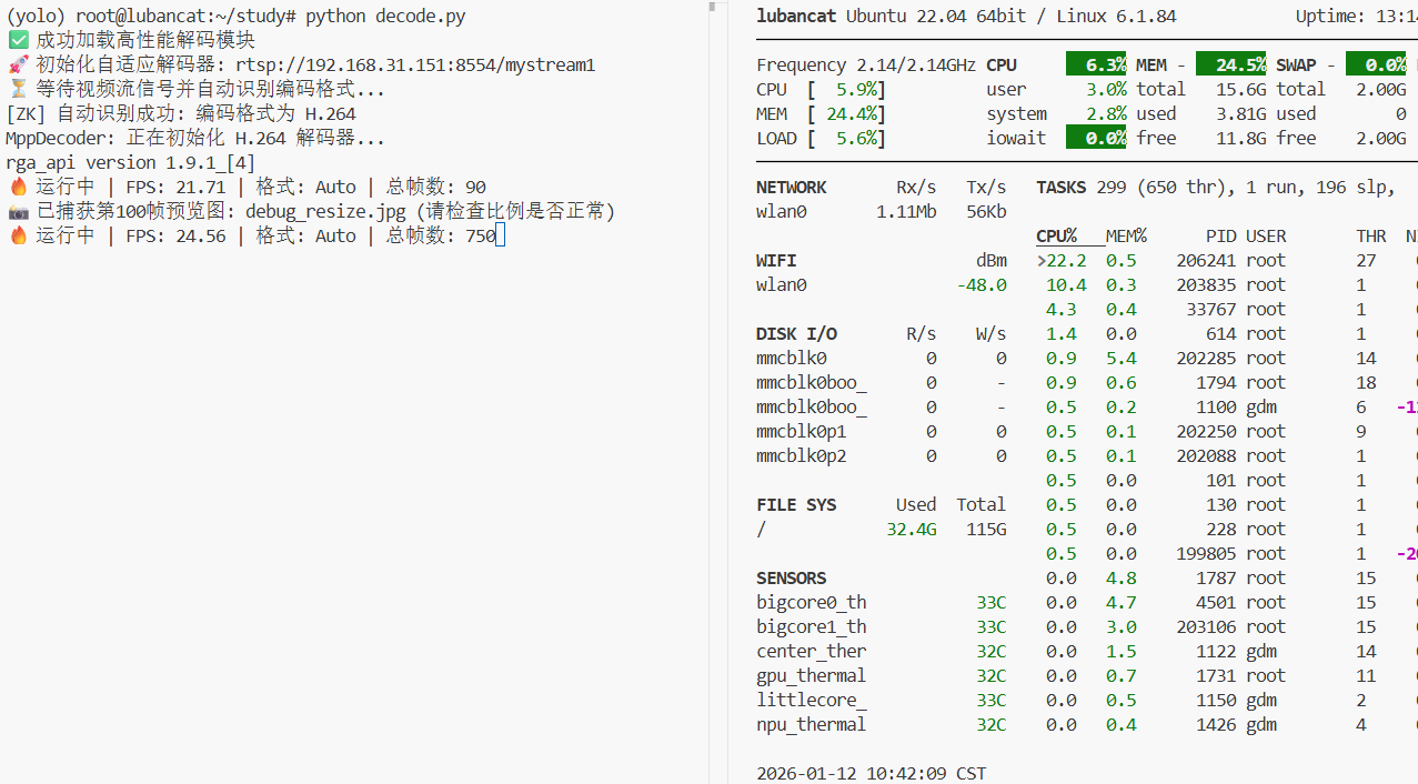 RK3588 拥有强大的 VPU(视频处理单元),宣称支持 32 路 1080P 解码。但在 Python 环境下,简单的 cv2.VideoCapture 只能利用 CPU 软解,跑两三路流就已经 CPU 爆满。