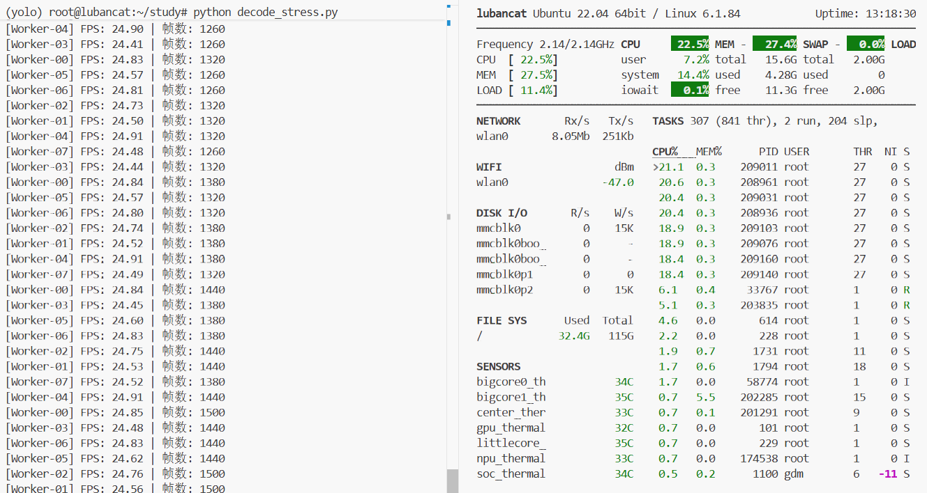 3. Python 端 8 路并行测试(一路解码cpu利用率约6%,八路解码cpu利用率约