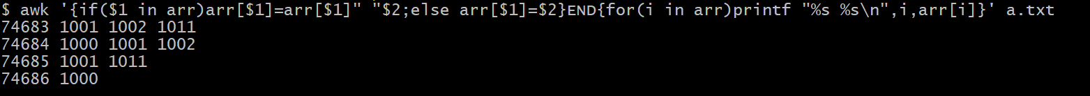 awk '{if($1 in arr)arr[$1]=arr[$1]" "$2;else arr[$1]=$2}END{for(i in arr)printf "%s %s\n",i,arr[i]}' a.txt