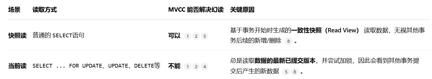 MVCC(多版本并发控制)并不能完全解决幻读问题,其能力边界主要取决于具体的操作类型(快照读 vs. 当前读)以及数据库的实现机制。
