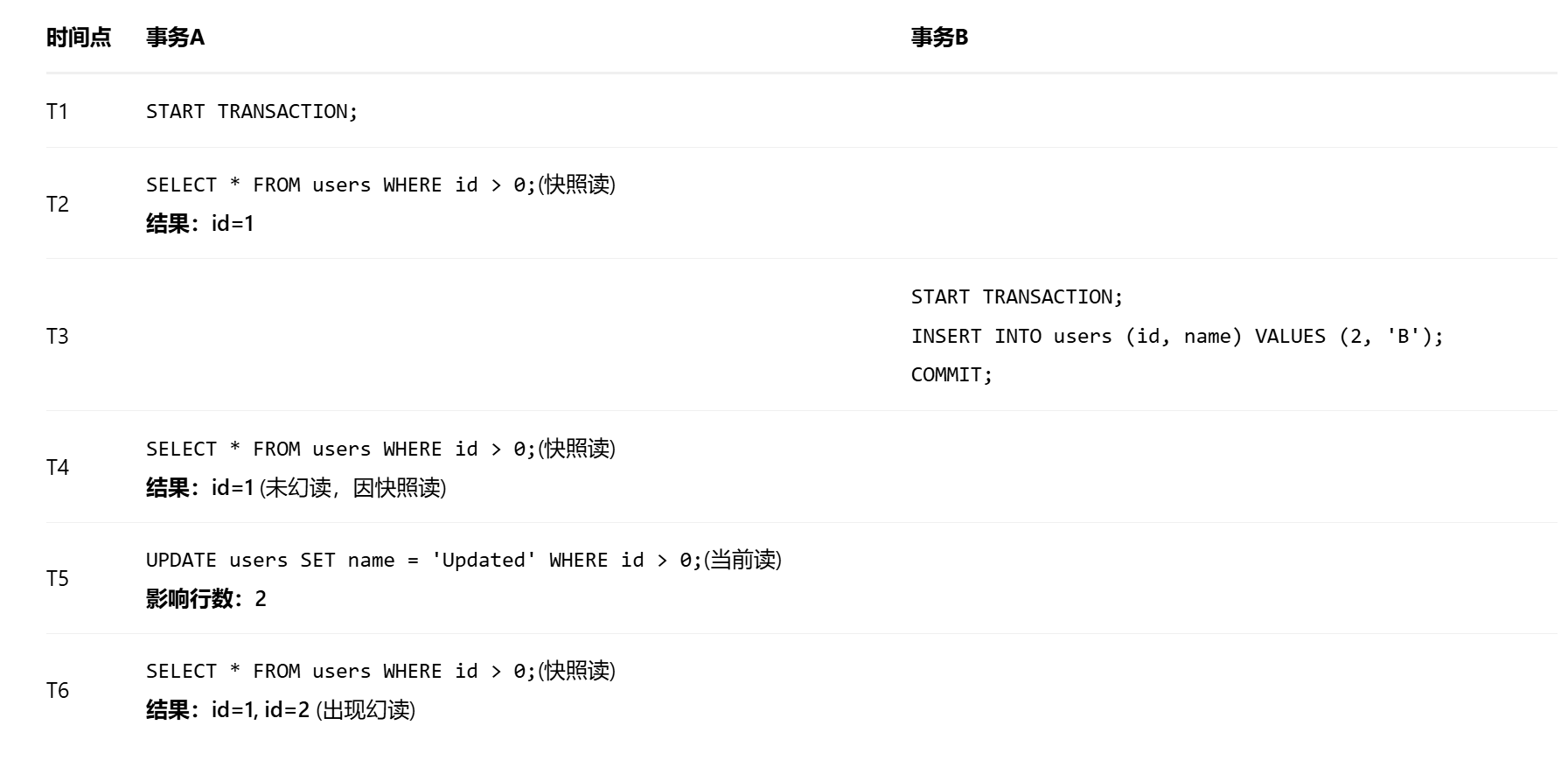 • 问题出在 T5 时刻。当事务A执行 UPDATE(当前读)时,它读到了事务B已提交的新数据 id=2,并成功更新了这行。