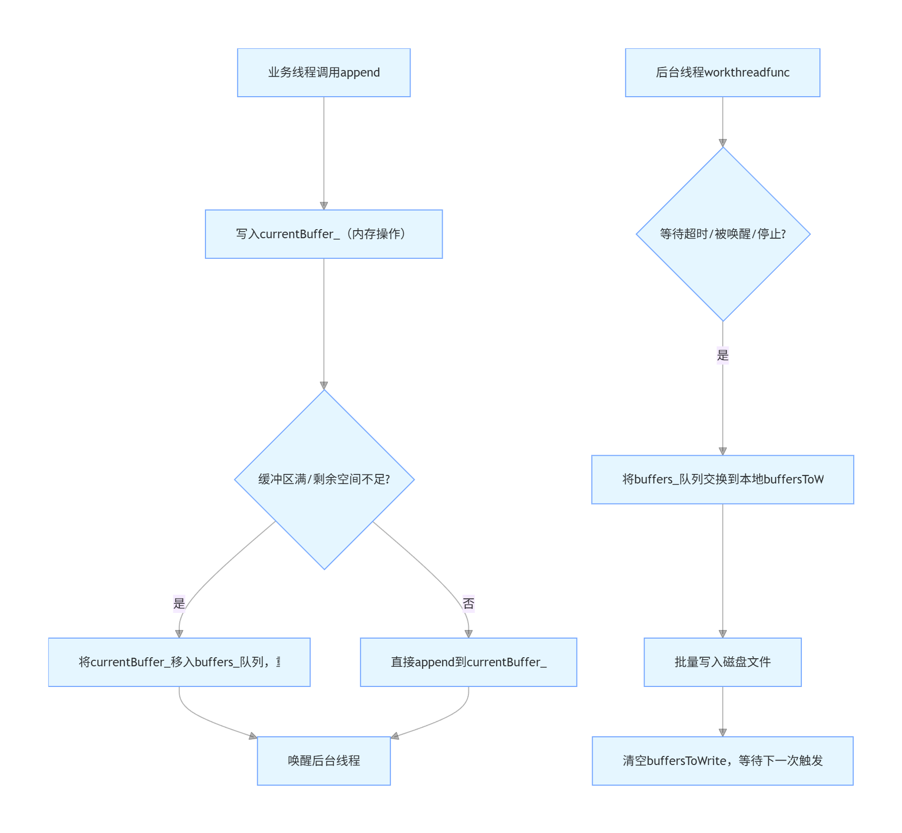 std::atomic<bool> running_:线程安全的状态标记,避免多线程读写竞争;std::mutex保护缓冲区:所有对currentBuffer_/buffers_的操作都加锁;std::condition_variable:实现线程的高效等待 / 唤醒,避免忙等(CPU 空转)。