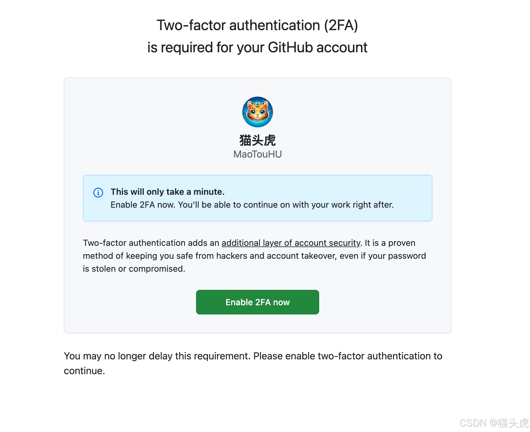 当 GitHub 弹出启用 2FA 提示时,界面类似下面这张图:点击 启用 2FA,进入 GitHub 设置流程。
