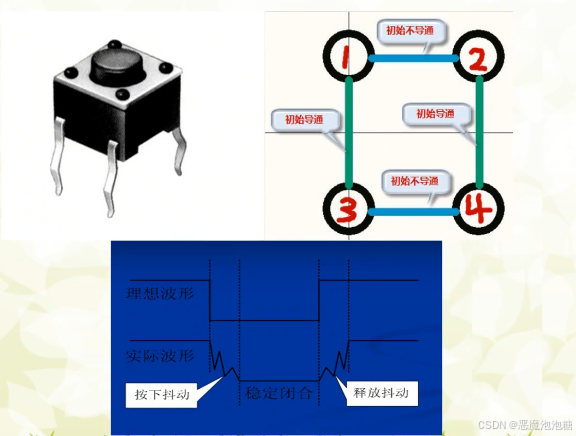 当P0.0接在开关一端,同时还接一个上拉电阻拉高电平,开关另一端接地,当如果开关是理想状态下,刚开始是高电平,然后按下开关,变成低电平,松开按钮,变成高电平,这个是理想状态下,但是实际中的开关,当按下开关瞬间有一个抖动,并不是马上就是低电平,而是一个不稳定状态的电平,可能刚开始低电平,然后变成高电平,又变成低电平,可能会执行多次低电平。