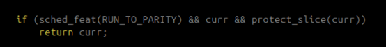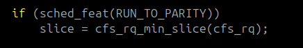 支持RUN_TO_PARITY的内核在计算保护的时间片长短时,会将运行队列中最小时间片拿出来作为计算数值之一,而不支持这一特性的内核则没有这样的逻辑。