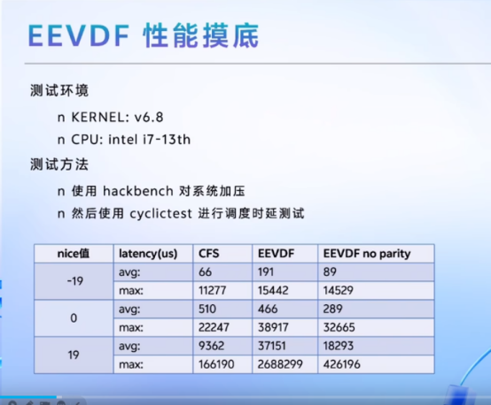 第二十届中国Linux开发者大会(CLK)的调度,性能与调试分论坛上,腾讯的内核工程师臧春鑫先生分享了他对eevdf算法改进的经验。其PPT中关于CFS,EEVDF和关闭no parity的EEVDF调度策略对调度延时的影响数据令人印象深刻。