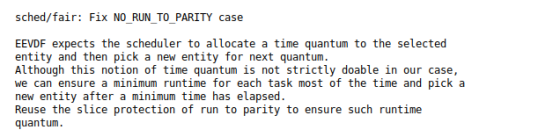 事实上,所谓NO PARITY,指的是关闭Linux进程调度器特性RUN_TO_PARITY。而演讲者在讲台上讲解的更多是6.17版本之前的Linux内核,后续版本RUN_TO_PARITY在调度器中发挥的功能又有一些不同。