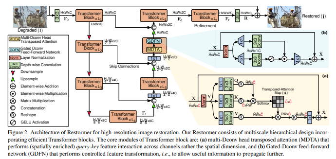 这篇论文提出了一种名为 Restormer 的高效 Transformer 模型,专门用于高分辨率图像恢复任务。核心目标是解决传统 Transformer 在图像恢复中计算复杂度随空间分辨率二次增长的问题,同时保留其捕捉长程像素依赖的优势,最终在多种图像恢复任务中实现 state-of-the-art(SOTA)性能。以下是从头到尾的详细总结: