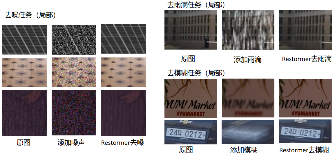 - 任务覆盖:图像去雨、单图运动去模糊、散焦去模糊(单图 + 双像素数据)、图像去噪(高斯灰度 / 彩色去噪、真实图像去噪);