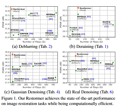 - 去模糊(GoPro 数据集):PSNR 高于 MPRNet(CVPR21)、IPT(CVPR21)等方法,同时 FLOPs 更优;