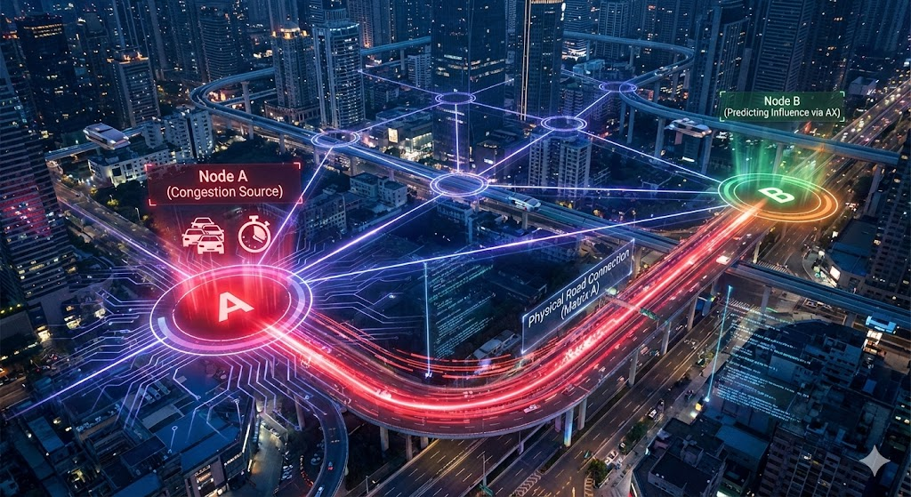 当路口 A 发生拥堵时,GNN 会通过图结构,将"拥堵"这个特征传递给下游的路口 B。模型通过学习发现:只要 A 堵了,B 在 10 分钟后也会堵。这就是学到了空间因果性。