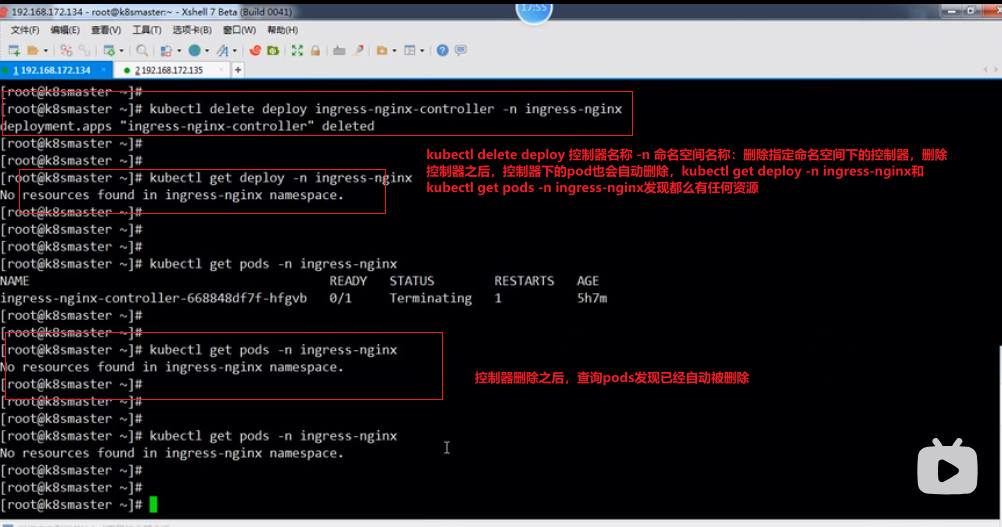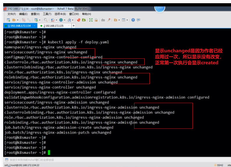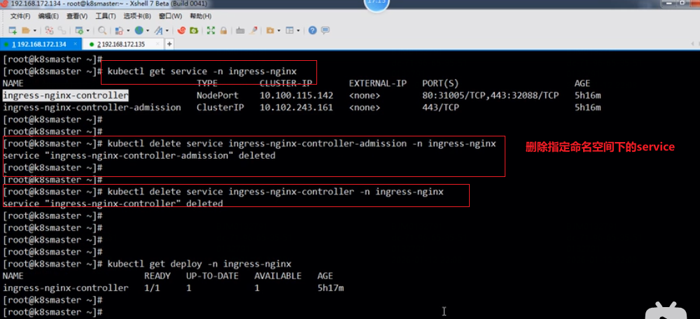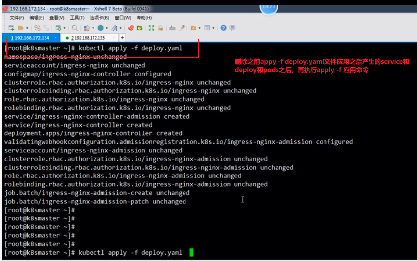即有对应的service和deploy,但是没有正常的pod即pod状态不是Running,把ingress-nginx命名空间下的service和deploy全部删除(deploy删除之后pods会自动被删除),重新再执行kubectl apply -f deploy.yaml命令显示成功,pods状态正常:
