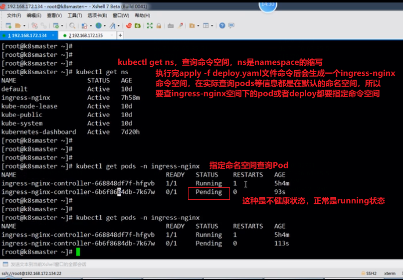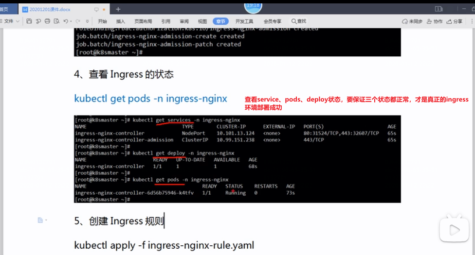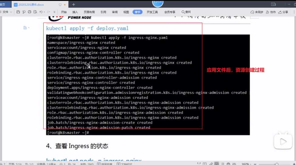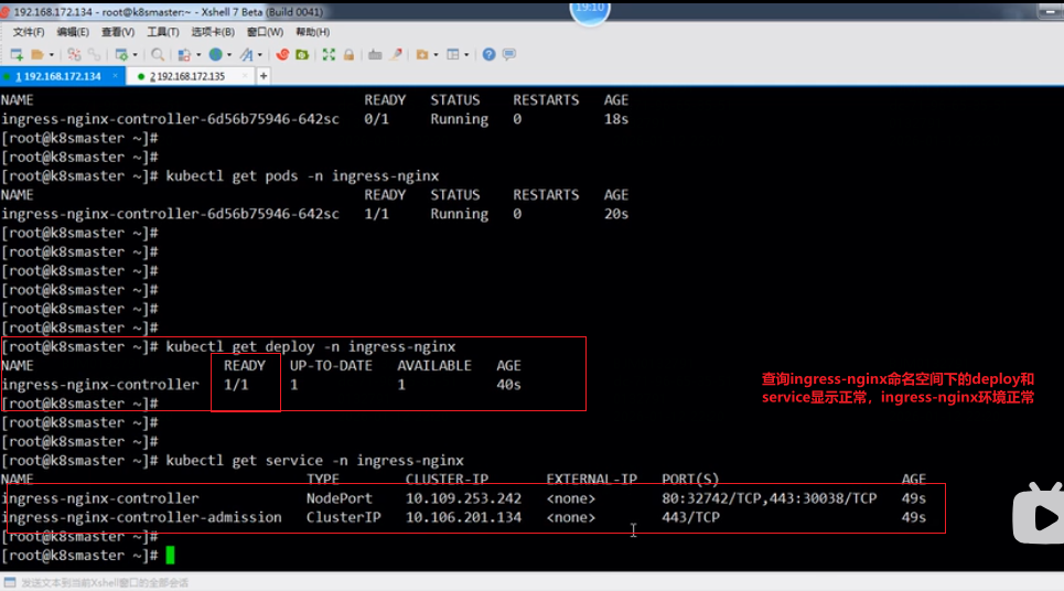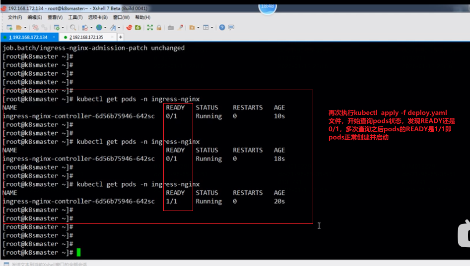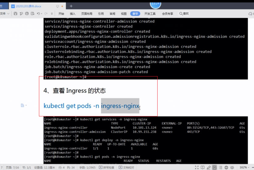 5.应用文件,创建资源:kubectl apply -f deploy.yaml文件,查询ingress-nginx命名空间下创建的资源状态是否正常
