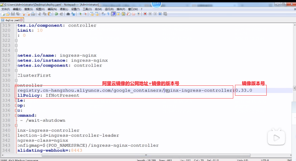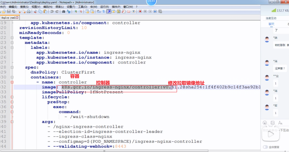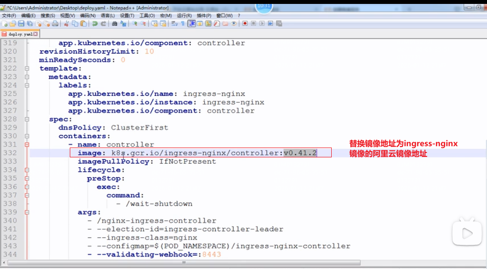 3.修改deploy.yaml文件中ingress-nginx-controller控制器镜像拉取镜像地址,改成阿里云镜像地址