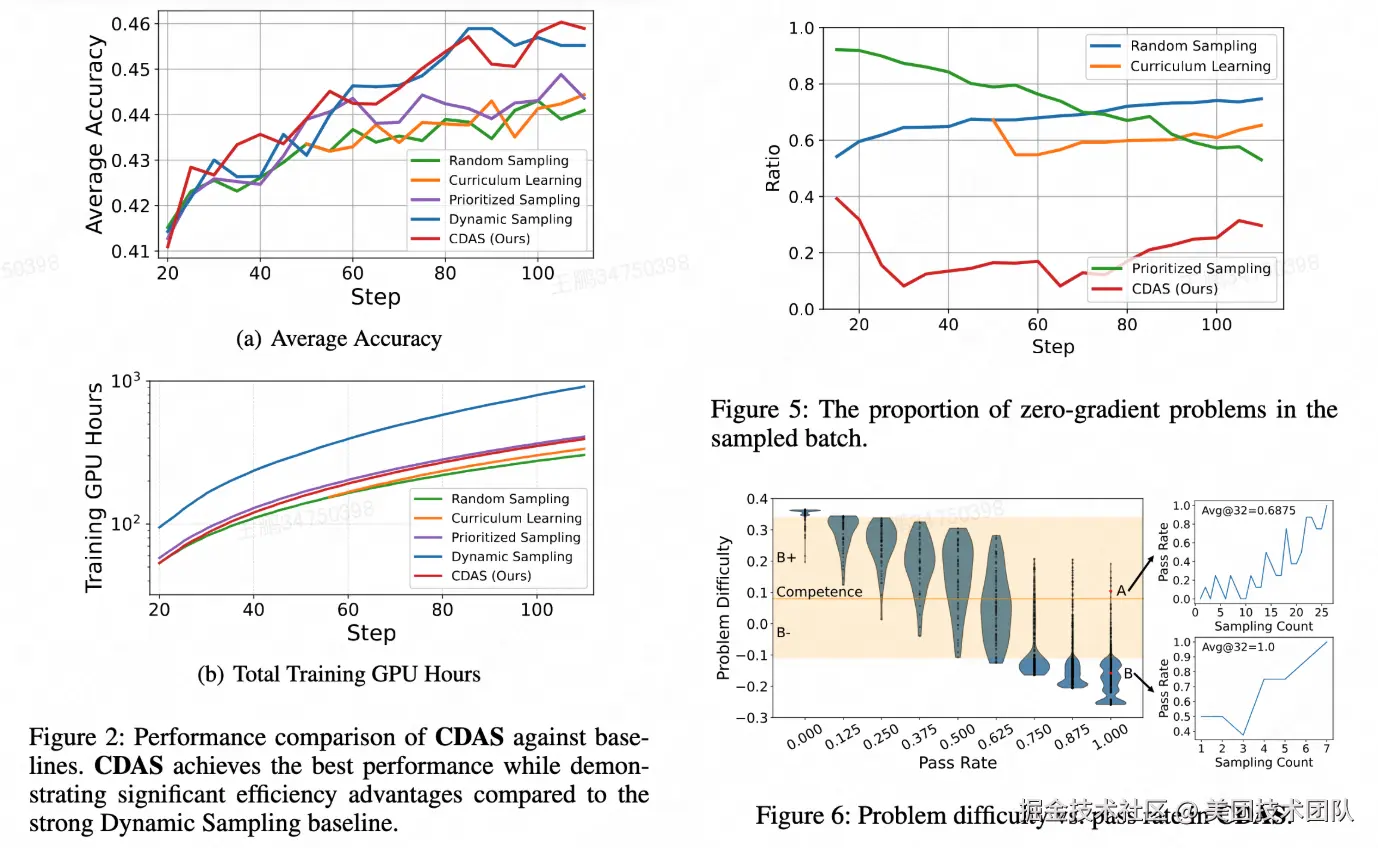 针对这些问题,本文提出了 CDAS(Competence-Difficulty Alignment Sampling):一种将模型能力与问题难度显式建模并对齐的动态采样方法。CDAS 不依赖单步通过率,而是通过累积历史表现差异来构建更稳定的难度估计;同时定义模型能力,并以不动点系统确保两者在训练过程中共同收敛。基于能力---难度差值构建对齐指标,再通过对称采样策略,选取最匹配模型当前能力的问题,从而提升有效梯度比例与训练效率。CDAS 在数学推理和代码生成场景中均通过 RL 训练 验证,结果显示 CDAS 显著提升了采样效率与模型性能,击败了多种主流采样策略。
