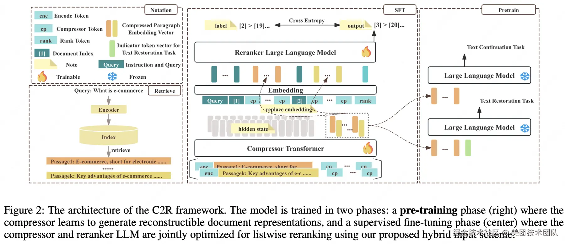 为了解决这些问题,我们提出了一种高效的框架压缩后排序(Compress-then-Rank, C2R),该框架不是直接对原始段落进行列表重排序,而是对其紧凑的多向量代理进行操作。这些代理可以预先计算并缓存,适用于语料库中的所有段落。C2R 的有效性依赖于三项关键创新。首先,压缩模型通过结合文本恢复和文本延续目标进行预训练,生成高保真的压缩向量序列,从而减轻了单向量方法中常见的语义损失问题。其次,一种新颖的输入方案将每个序数索引的嵌入添加到其对应的压缩向量序列前,这不仅划定了段落边界,还引导重排序 LLM 生成排序列表。最后,压缩模型和重排序模型通过联合优化,使压缩过程对排序目标具有排序感知能力。在主要重排序基准上的广泛实验表明,C2R 在提供显著加速的同时,能够实现与全文重排序方法相当甚至更优的排序性能。