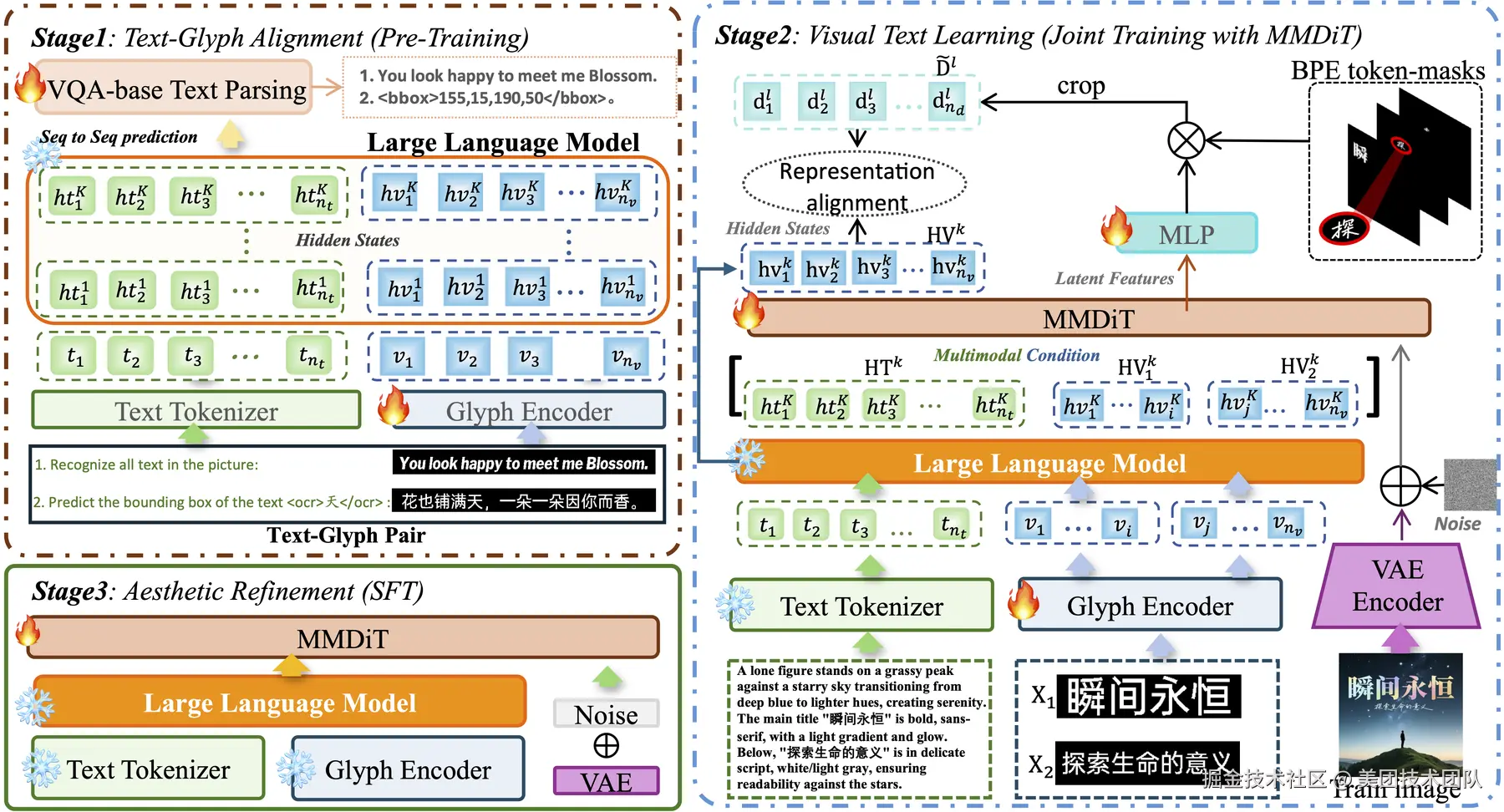 针对这一关键挑战,我们提出ViType三阶段对齐增强框架:首先通过视觉问答机制实现文本-字形显式对齐,将字符视觉结构注入大语言模型语义空间;其次创新性地将预对齐字形嵌入与文本token同步输入多模态扩散Transformer,通过联合训练建立跨模态特征协同;最后基于高质量图文对进行美学精调,确保生成图像的版式和谐与视觉美感。该框架使字符准确率提升15%以上,为电商海报、营销物料等高精度视觉内容创作提供了可靠的技术支撑。
