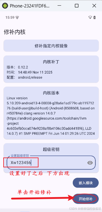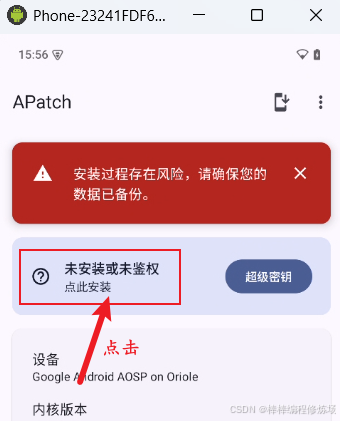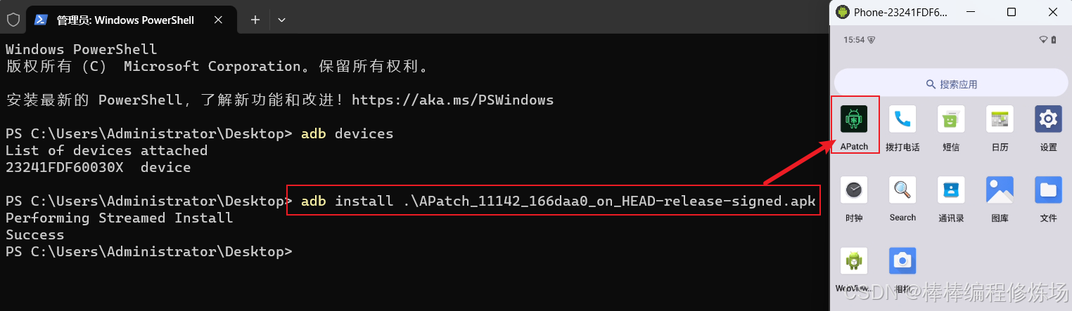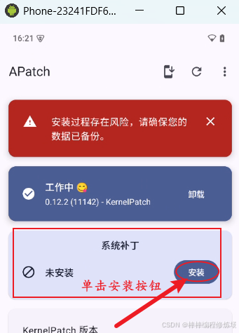 手机开机,安装 APatch App:adb install .\APatch_11142_166daa0_on_HEAD-release-signed.apk