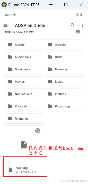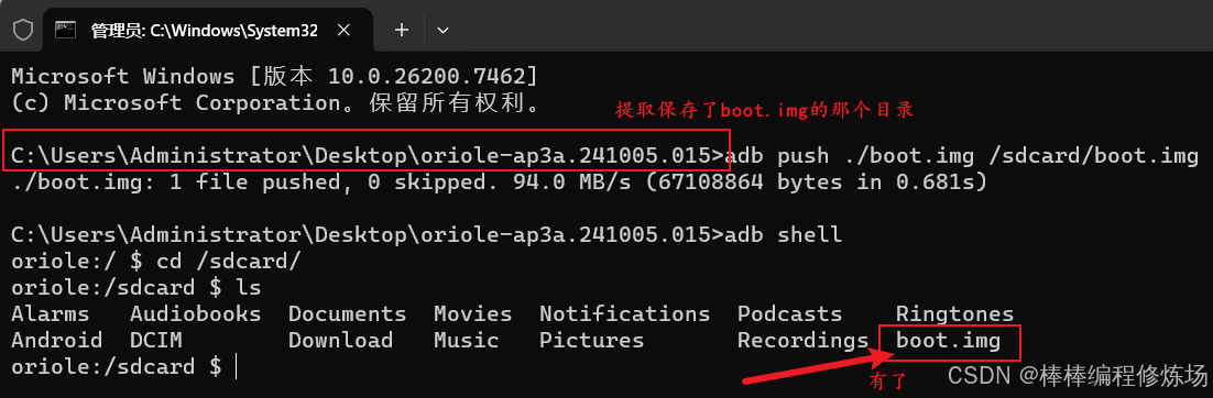 将电脑上的 boot.img 推送到手机里:adb push ./boot.img /sdcard/boot.img