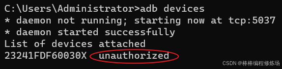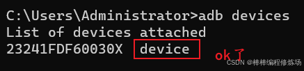 验证连接,在电脑终端输入:adb devices。成功 :显示 设备序列号 device。失败:显示 unauthorized(未在手机点允许)或为空(驱动没装好)。