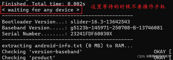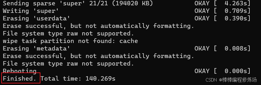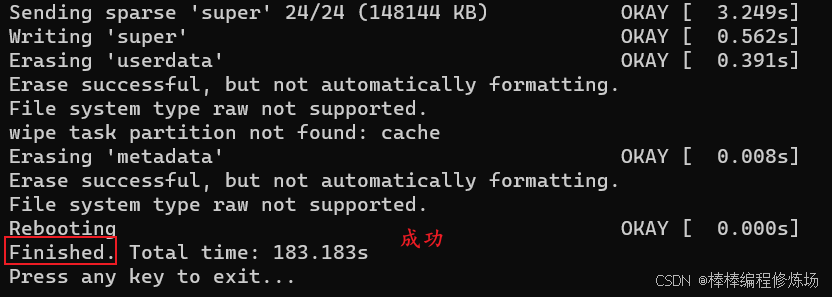 设置好了之后,重开 cmd 窗口,同样执行命令:fastboot flashall -w,等待刷机完成就可以了。有惊无险: