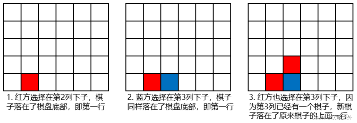 竖直四子棋的棋盘是竖立起来的,双方轮流选择棋盘的一列下子,棋子因重力落到棋盘底部或者其他棋子之上,当一列的棋子放满时,无法再在这列上下子。