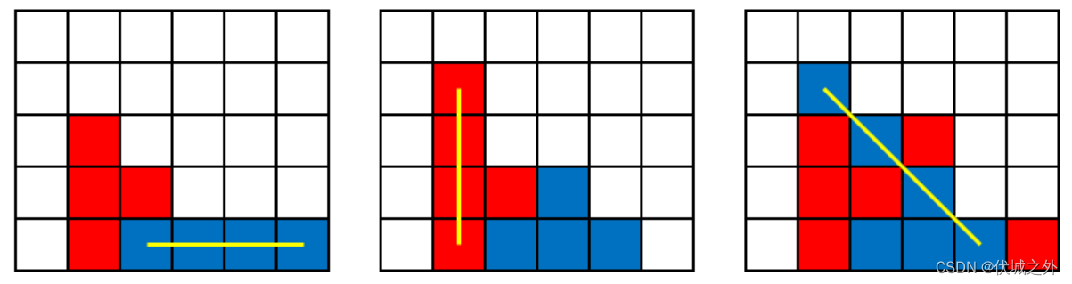 一方的4个棋子横、竖或者斜方向连成一线时获胜。