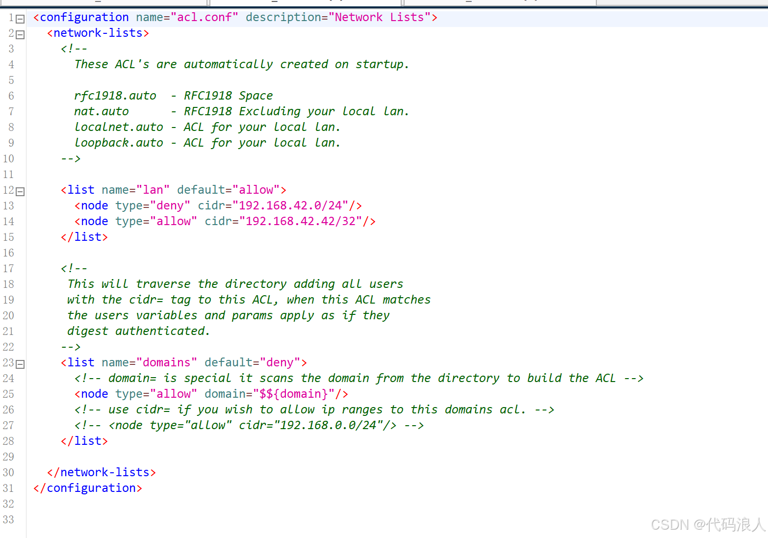 domains列表的作用是通过遍历目录来添加带有cidr=标签的所有用户到此ACL,并在匹配用户的变量和参数时,如同它们已经被摘要认证一样应用。