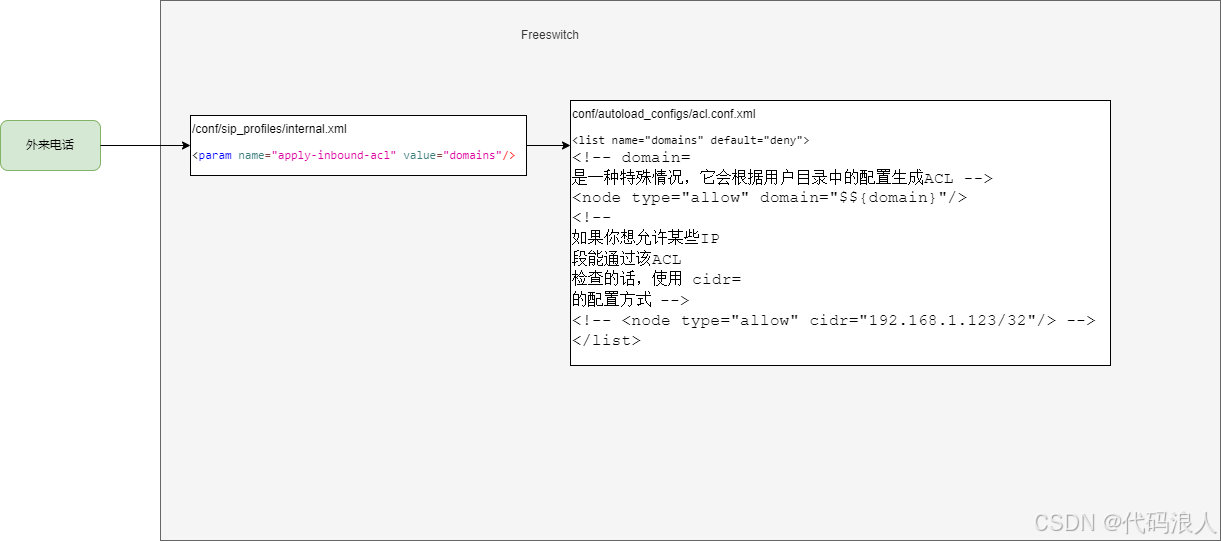 internal Profile默认使用domains这个ACL进行鉴权。读者可以在internal.xml配置中找到如下的配置: