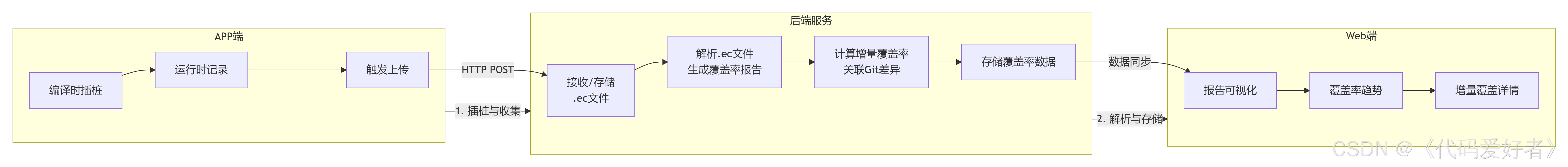 要实现您描述的自动化代码覆盖率采集、上报、解析与展示系统,需要分别在APP端 、后端服务 和Web前端进行协作。整体流程如下图所示: