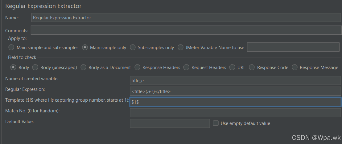 8.Fetch external DTDs:如果选中该项,外部将使用 DTD 规则来获取页面内容。引用名称:下一个请求要引用的参数名称,如填写 title,则可用${ var_regexp2}引用它。 (一些 XML 元素具有属性,属性包含应用程序使用的信息,属性仅在程序对元素进行读、写操作时,提供元素的额外信息,这时候需要在 DTDs 中声明)