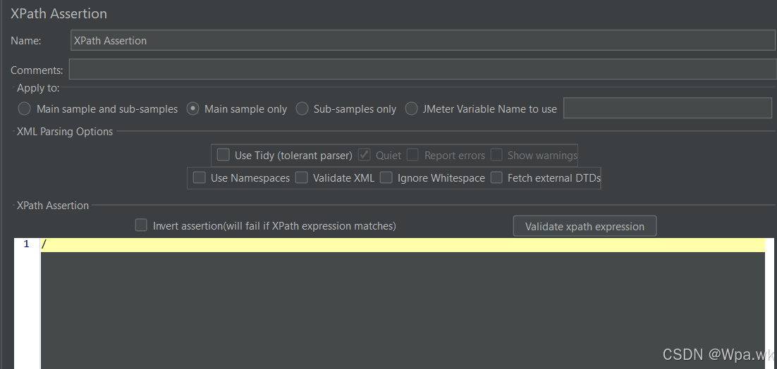 作用:XPath 是一种用于在 XML 文档中定位和选择元素的语言,通过 XPath Assertion,可以使用 XPath 表达式来验证响应中的特定内容,例如检查特定元素、属性或文本是否存在或符合条件。