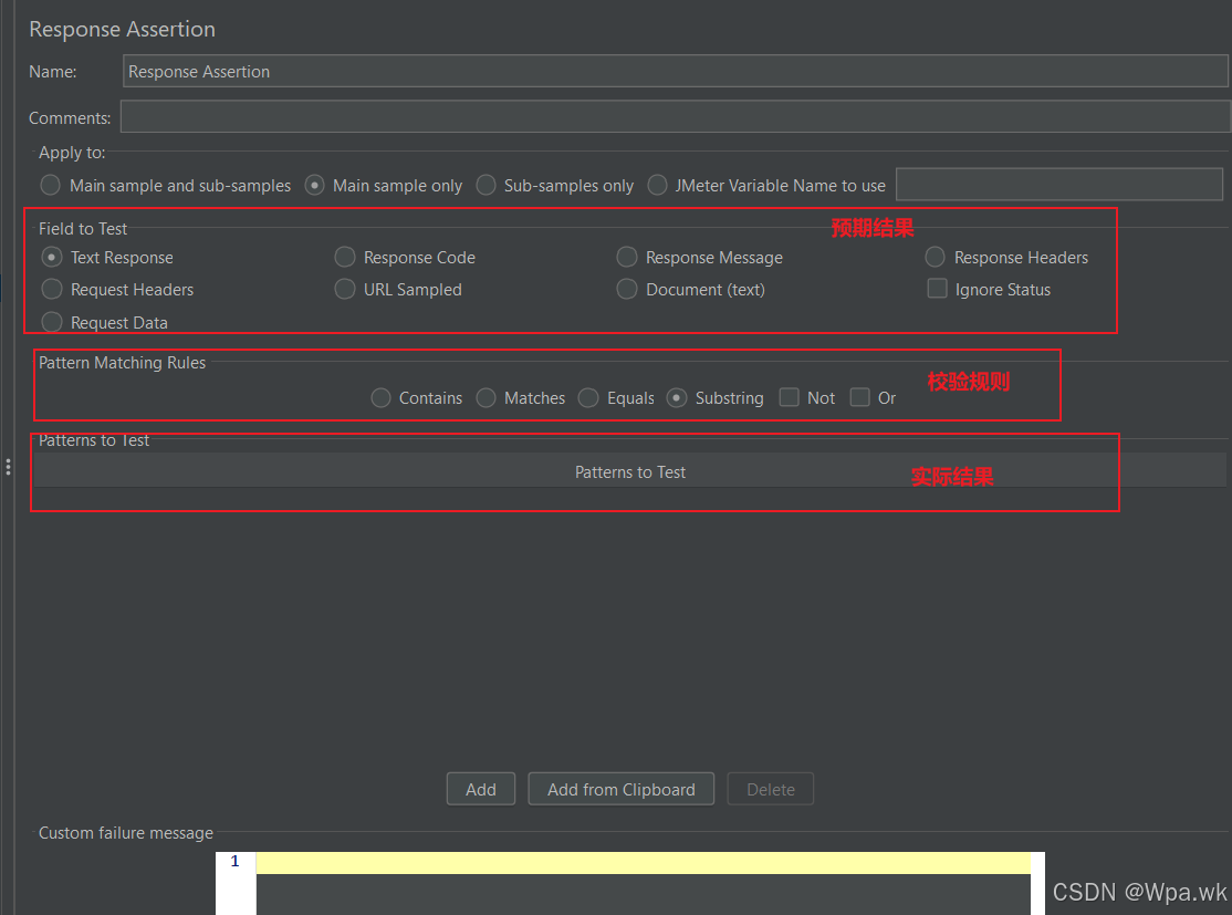 作用:可以基于响应的内容、代码、消息或其他属性进行断言。可以根据响应文本、响应代码、响应消息和其他参数来定义断言条件,并指定断言模式(包含、匹配、不包含等)。