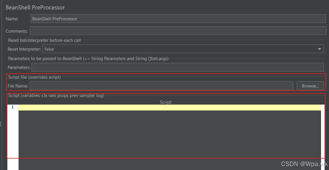 - Script file:包含要运行的 BeanShell 脚本的文件,文件名存储在变量 FileName 中,添加了脚本文件后,就只会运行添加的脚本文件,Script 部分的脚本代码不会运行了。