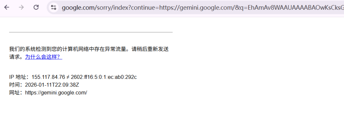 这行文字显示你的 IPv4 地址 和 IPv6 地址 所属的出口不一致(通常是因为 节点 的"漏水"或分流设置问题)。Google 检测到我们试图用两个不同的身份(IP)同时访问同一个会话,系统会判定这具有高度风险,从而直接拦截。