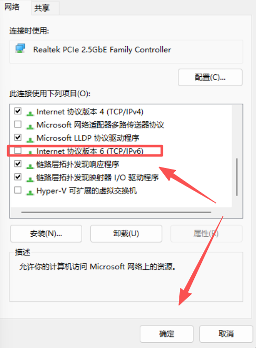 取消勾选 "Internet 协议版本 6 (TCP/IPv6)"