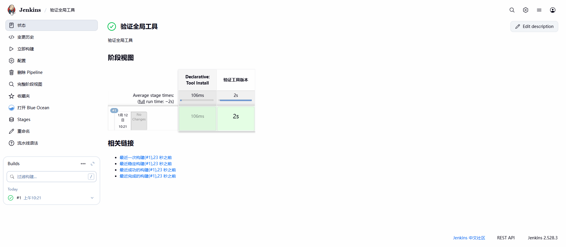 通过以上步骤,完成了 Jenkins 全局安全配置(专有用户数据库+基于角色授权)、全局工具配置(JDK/Git/Maven/NodeJS),并通过流水线任务验证了所有工具的可用性。若所有工具版本均正常输出,则全局工具配置生效,可用于后续项目构建。