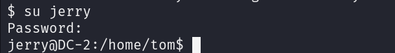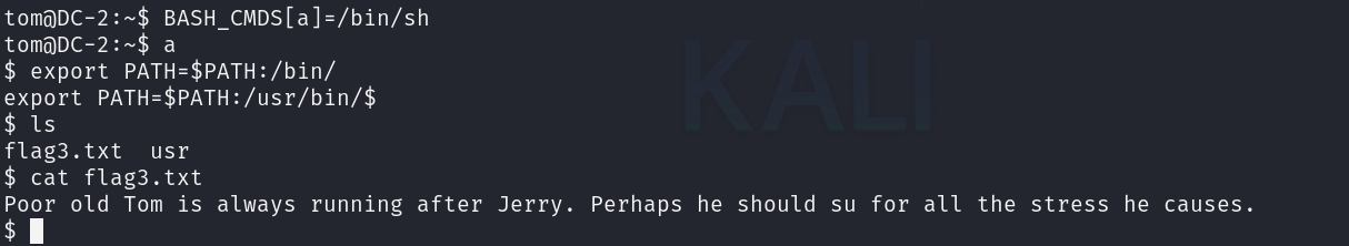a时,rbash 会通过BASH_CMDS找到/bin/sh并执行,从而进入不受限的 /bin/sh****环境 (提示符从tom@DC-2:~$变成$,说明 shell 已切换)。
