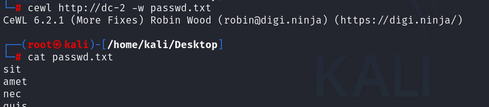 wpscan --url http://dc-2/ -e -U /home/kali/Desktop/user.txt -P /home/kali/Desktop/passwd.txt