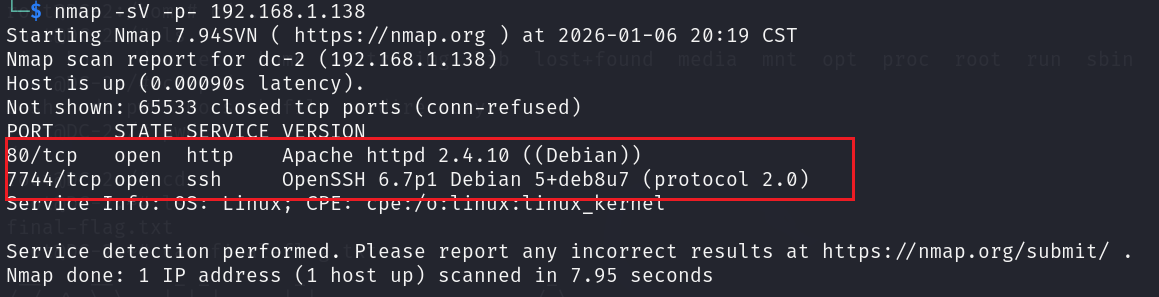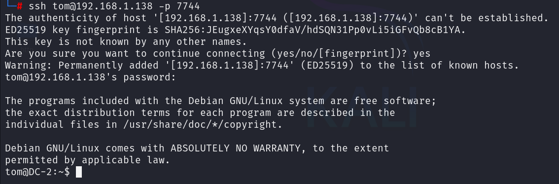 根据 flag2 的提示,需要找到另一个切入点。之前信息收集到的 7744 端口和 tom 用户还没用。密码是之前爆破出来的密码。
