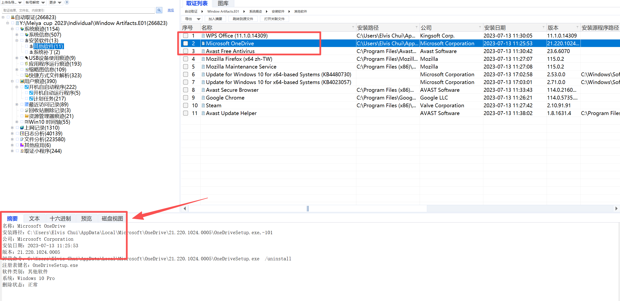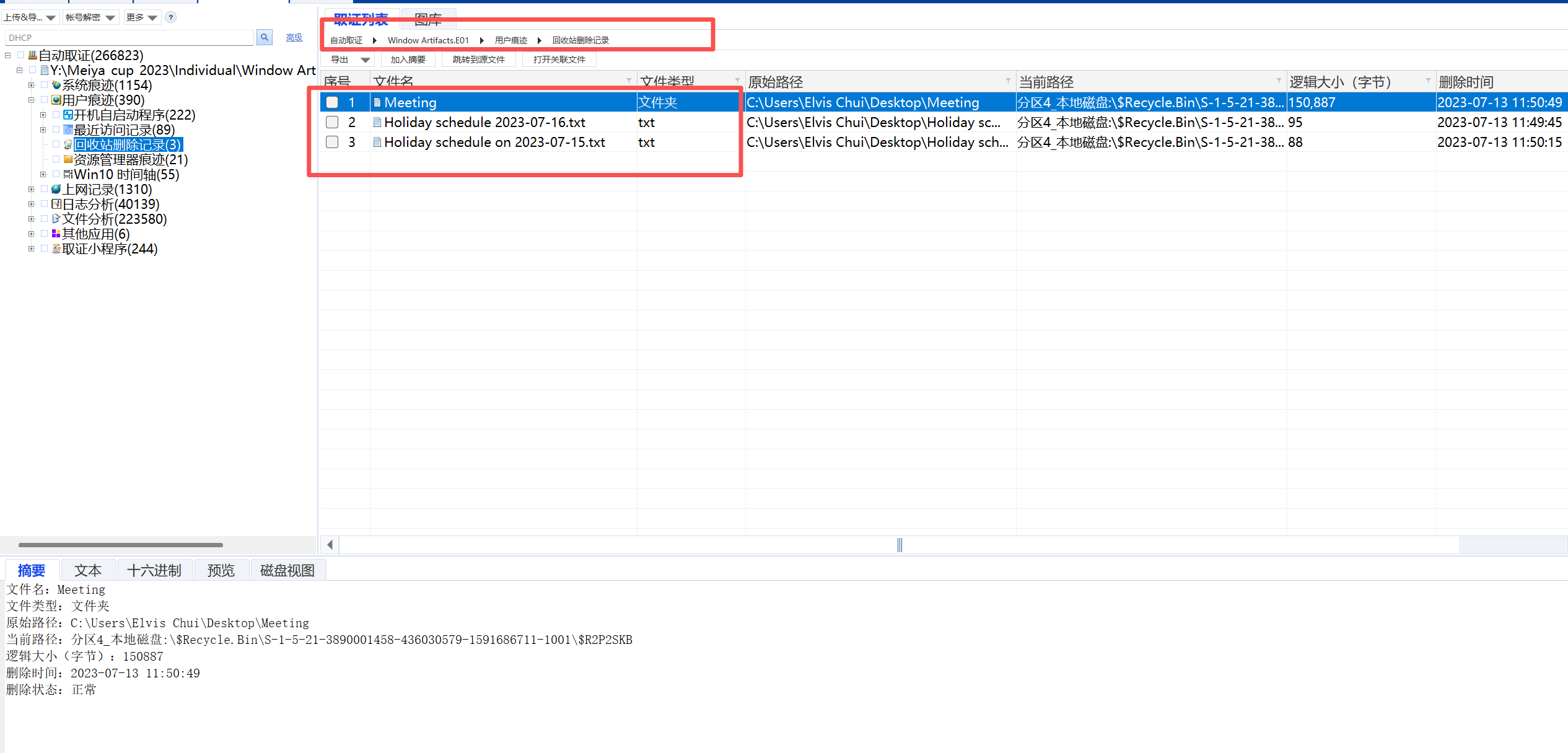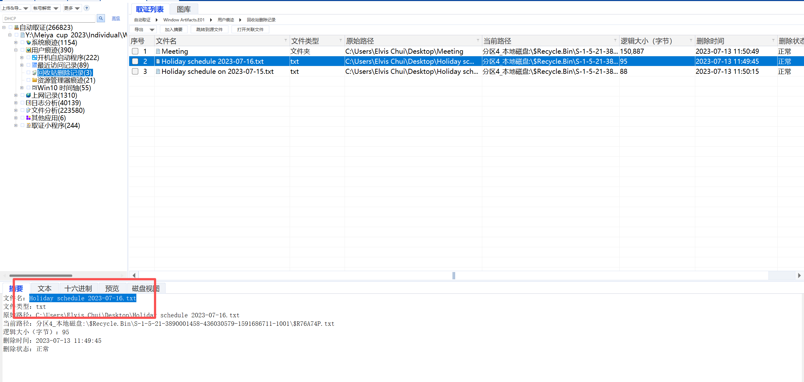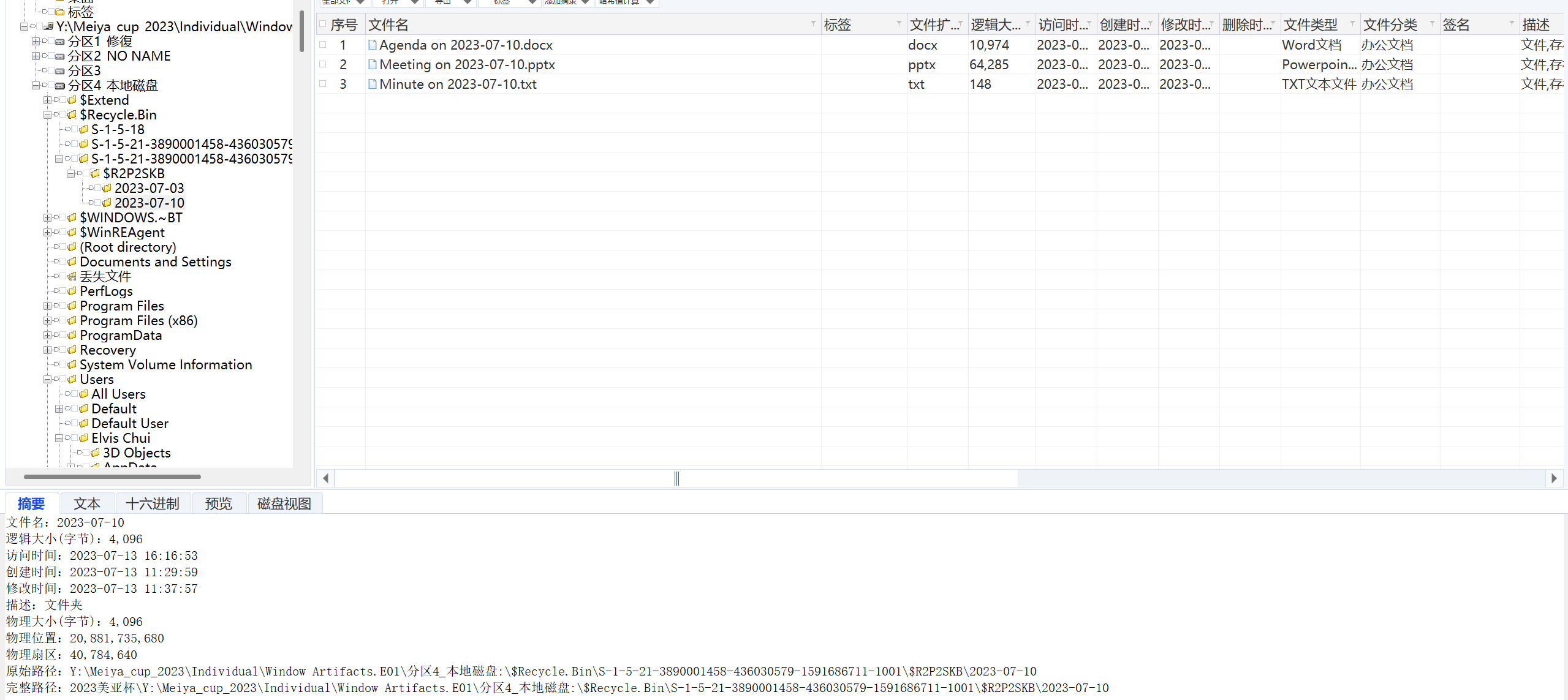 填空题\] Elvis Chui 总共登入过该计算机多少次?根据 'Window Artifacts.E01' 内的Windows 注册表记录 #### 开始查找 从系统痕迹中开始查找 系统痕迹 ---\> 用户信息 ---\> Elvis Chui 发现为11次  ## 2 #### 题目描述: 该计算机的操作系统是在哪一个时区? #### 开始查找 直接从这样查找 系统痕迹 ---\> 系统信息 ---\> 时区信息 是:UTC+8  ## 3 #### 题目描述: 该计算机的操作系统于何时安装?(以计算机系统时区回答) #### 开始查找 直接 系统痕迹 ---\> 系统信息 ---\> 安装时间 是在:2023-07-13 11:18:14  ## 4 #### 题目描述: 哪(几)个程序会于操作系统启动时自动执行? #### 开始查找 直接在 用户痕迹 ---\> 开机自启动程序 ---\> 开机自动运行程序 有以下5个  ## 5 #### 题目描述: 该计算机内安装了以下哪一个程序? A. QQ B. WPS Office C. Opera D. Kaspersky #### 开始查找 直接在 系统痕迹 ---\> 安装软件 ---\> 其他软件 可以看到只有WPS Office有 答案:WPS Office  ## 6 #### 题目描述: 计算机内的OneDrive程序版本是什么? #### 开始查找 还是 系统痕迹 ---\> 安装软件 ---\> 其他软件 可以看到它的版本为: 21.220.1024.0005  ## 7 #### 题目描述: 计算机有一个正在连接的网络接口,该接口连接DHCP服务器的IP地址是多少?提示: 以 IPV4格式回答 #### 开始查找 这里查看 系统痕迹 ---\> 网络配置 ---\> 网络连接 可以发现有一个DHCP服务器,刚好它问的是该接口连接DHCP服务器的IP是多少,那么就是这个 答案:192.168.88.254  ## 8 #### 题目描述: 参考'Window Artifacts.E01'内的Windows注册表回答以下题目,该计算机何时连接过一只U盘?(以计算机系统时区回答) A. 2023-07-13 11:48:26 B. 2023-07-13 03:48:29 C. 2023-07-12 19:48:29 D. 2023-07-13 11:48:29 #### 开始查找 从这里查找 系统痕迹 ---\> USB设备使用痕迹 ---\> 正常的USB设备使用痕迹 上面的Hub是集线器,那么就只有这个了 2023-07-13 11:48:28 时间上有一秒的差异,可能是因为取整策略不同 选择 D 选项  ## 9 #### 题目描述: Elvis Chui 将哪几个文本文件放在回收站中? A:$+D10I76A74P.txt B:Holiday schedule 2023-07-16.txt C:Holiday schedule 2023-07-13.txt D:Minute on 2023-07-01.txt E:Minute on 2023-07-10.txt #### 开始查找 直接在 用户痕迹 ---\> 回收站删除记录 中查找  但是这里的meeting文件无法打开,跳转到源文件看一下  到这个文件夹下了,打开看看  有个7月3号和10号的文件夹,看看10号的 3号的都是选项中没有的文件所以就不管了,看到10号的中有一个是选项中的  答案:BE ## 10 #### 题目描述: Elvis Chui在什么时间删除了第一个文本文件?(以计算机系统时区回答) A. 2023-07-13 11:50:15 B. 2023-07-13 03:49:45 C. 2023-07-13 03:50:15 D. 2023-07-13 11:49:45 #### 开始查找 上题的第一个文本文件是Holiday schedule 2023-07-16.txt 那么直接看它的删除时间是多少 答案:2023-07-13 11:49:45  ## 11 #### 题目描述: Elvis Chui删除的第一个文本文件的文件名是什么?提示: 请用小写字母回答及需列明文件格式。如文件名字内有空格位置,请用_标示。例如: go_to_school.docx #### 开始查找 还是和上题一样的文件,只不过是文件名了 答案:holiday_schedule_2023-07-16.txt  ## 12 #### 题目描述: Elvis Chui删除的第一个文本文件在什么时间创建?(以计算机系统时区回答) A. 2023-07-13_11:42:39 B. 2023-07-13_11:50:49 C. 2023-07-13_11:49:45 D. 2023-07-13_11:45:22 #### 开始查找 在这里看不到创建时间,跳转到源文件 可以看到创建时间为 2023-07-13 11:45:22 选择D选项  ## 13 #### 题目描述: Elvis Chui计划于2023年7月15日20点5分有什么活动?提示: 答案请与文件内的文字与大细阶相同 #### 开始查找 找了一圈没发现7月15号的文件,但是突然一想,回收站里的那个名字就是写的7月15,打开看一下,看看是不是活动策划,发现还真是  答案就是2005的:Movie ## 14 #### 题目描述: 该计算机执行STEAM.EXE总共多少次?提示: 请用阿拉伯数字作答 #### 开始查找 直接在 系统痕迹 ---\> 应用程序运行痕迹 ---\> STEAM.EXE 下面会显示运行的时间和次数 答案:7